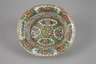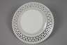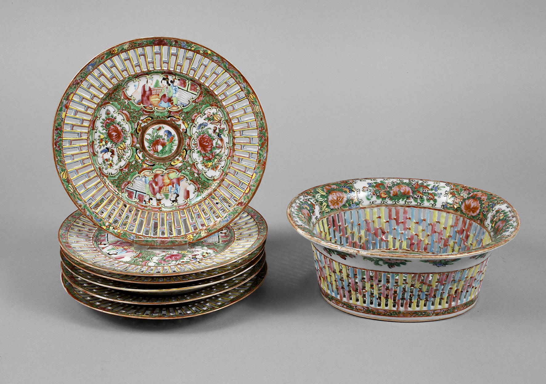 China, um 1920, ungemarkt, Weißporzellan in polychromer Emailbemalung mit Goldstaffage, sechs flache Dessertteller mit durchbrochen gearbeitetem Rand, im Spiegel mit figürlichen Szenen, gerahmt von Floralelementen, dazu Porzellankörbchen in korrespondierendem Dekor, min. berieben, D 22 cm, L Korb 23 cm.