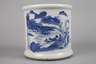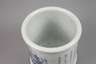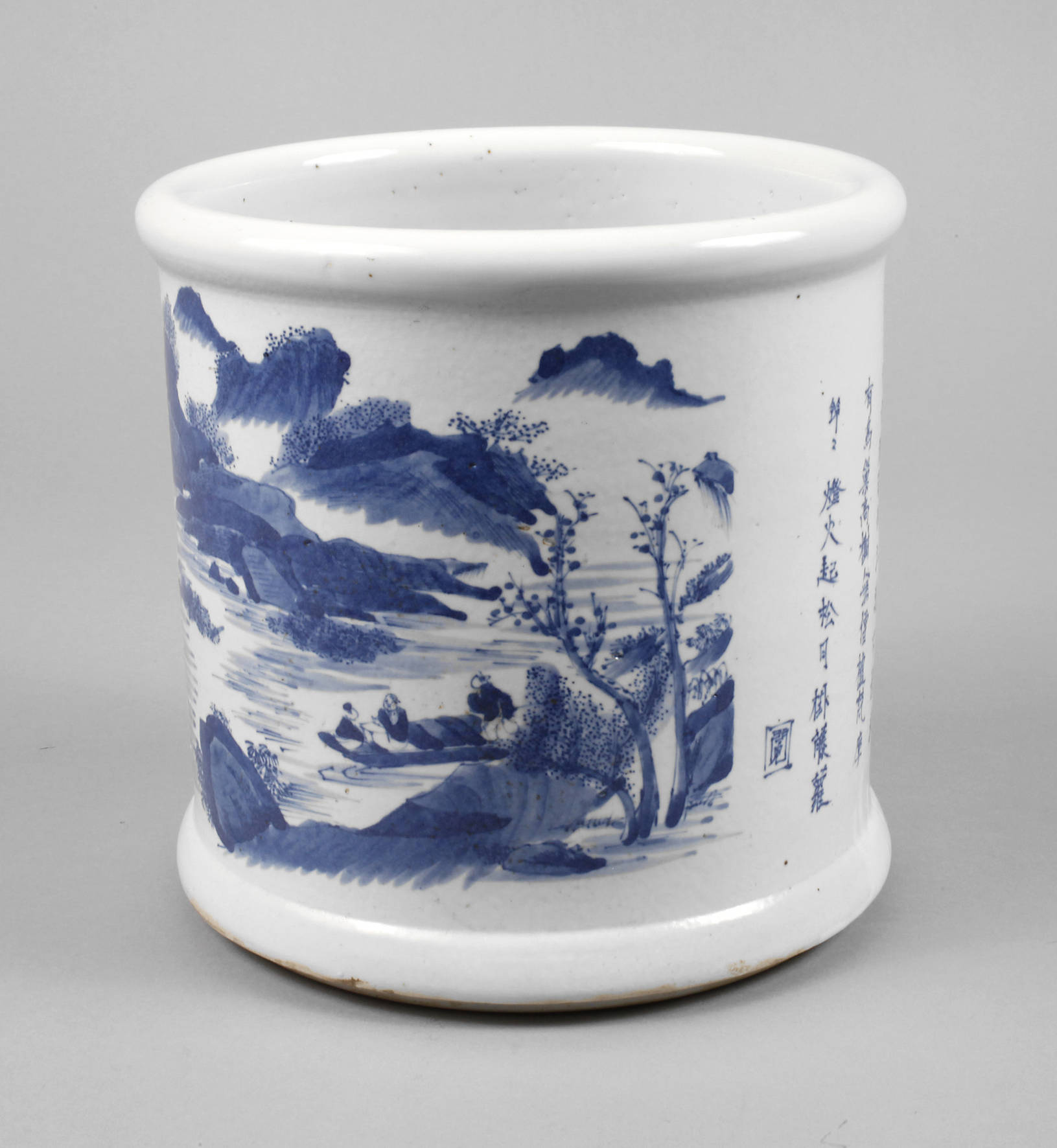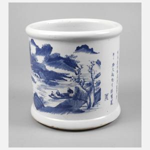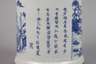 um 1900, signiert, Weißporzellan in kobaltblauer Unterglasurbemalung, zylindrischer Korpus, Front und Rückseite mit Landschaftsmotiven, dazwischen Kalligraphie, brandfleckig, H 21 cm.