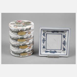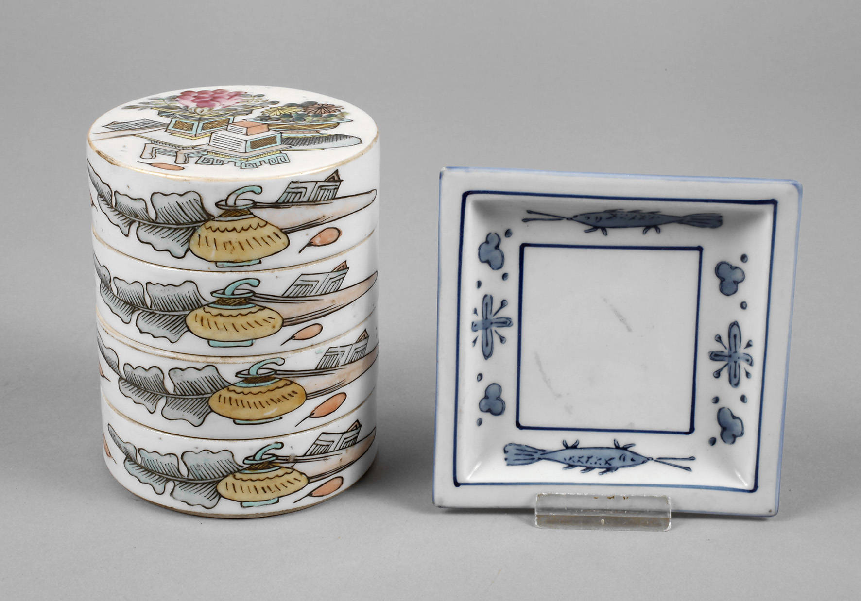 China, um 1900, vierfach unterteilte Stapeldose aus Weißporzellan, ungemarkt, polychrom in Emailfarben bemalt, kalligrafiert, dazu kleines quadratisches Zierschälchen mit Fischmotiv, gemarkt, Weißporzellan in kobaltblauer Unterglasurbemalung, min. Altersspuren, H Dose 11 cm, L Teller 10,5 cm.
