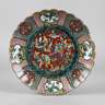 um 1920, am Boden gemarkt, Weißporzellan in polychromer Emailbemalung, mit partieller Goldstaffage, gerippt geschwungene Fahne, überaus detailreich ornamental verziert, im Spiegel vielfigurige Szene aus der chinesischen Sagenwelt, Rand mit Ausbruch, kleinere Farbverluste, D 29 cm.