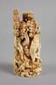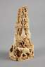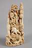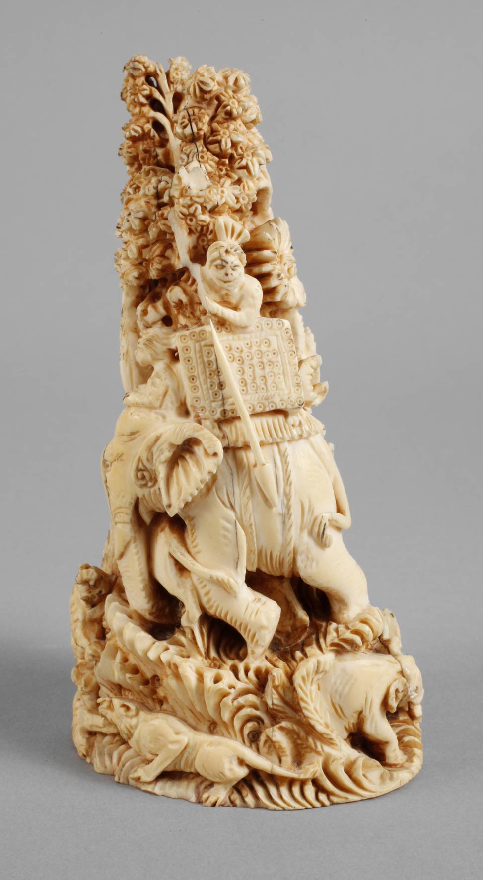 Ende 19. Jh., unsigniert, Elfenbein fein beschnitzt, aus einem massivem Endstück eines Zahns gefertigte Löwenjagdszene, die zahlreiche Wildtiere zwischen aufwendig beschnitzten vegetabilen Elementen zeigt, minimal bestoßen, trocknungsrissig, H 14 cm.