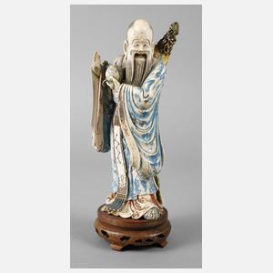 um 1920, Elfenbein fein beschnitzt, teils graviert, geschwärzt bzw. mehrfarbig gefasst, vollplastisch gearbeiteter, bärtiger Alter mit fröhlich lächelndem Gesicht, auf dem Rücken eine Kalebasse tragend, auf geschnitztem Holzsockel montiert, Substanzverluste, H 29 cm.