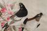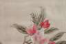 Japan, Anfang 20. Jh., feine pastelltonige Seiden-Nadelmalerei auf cremefarbenem Seidengrund, Darstellung zweier auf einem Kirschblütenast sitzender Vögel, orig. hinter Glas in schwarzer Lackleiste gerahmt, verso handschriftl. Widmung von 1925, IM 34 x 46 cm.