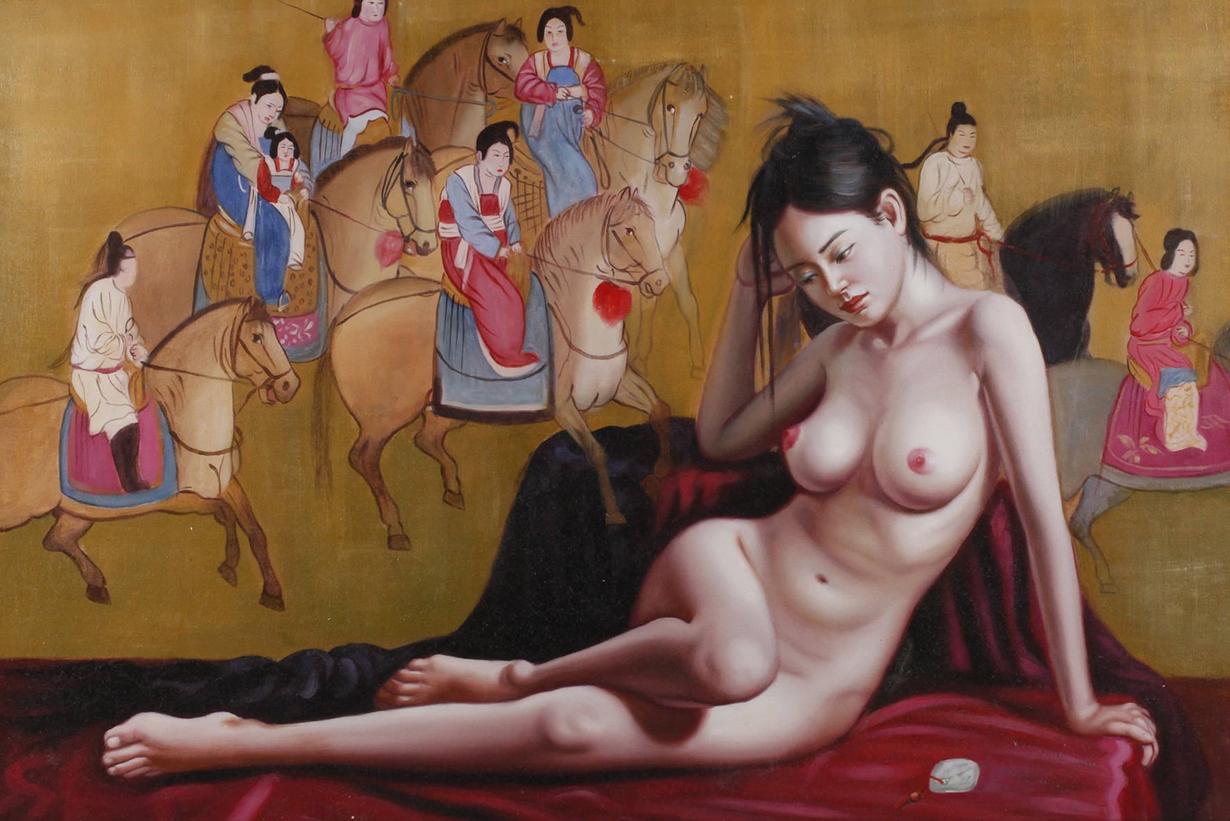 2. Hälfte 20. Jh., unsigniert, Gicléedruck auf Leinwand, weiblicher Akt auf purpurnem Tuch liegend, den Kopf auf den rechten Arm gestützt, der angewinkelt auf einem Kissen ruht, den Blick sinnend nach unten gerichtet, im Hintergrund eine Art Wandgemälde mit fünf Reiterinnen und zwei Reitern in traditionellen chinesischen Gewändern, geringe Altersspuren, ungerahmt, Maße ca. 60,5 x 91 cm.