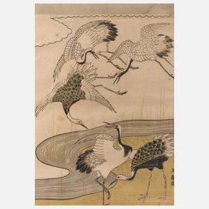 um 1920, signiert, Farbholzschnitt auf Seide, Darstellung mit fünf Reihern in Landschaft, min. Erhaltungsmängel, im Passepartout hinter Glas gerahmt, IM 27 x 18,5 cm.