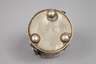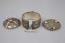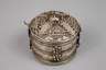 wohl 19. Jh., Neusilber getrieben, Runddose mit Kuppeldeckel, umlaufend mit Perlchen und Zierdrahtarbeiten geschmückt, auch als Armreif zu tragen, Altersspuren, D 7 cm.
