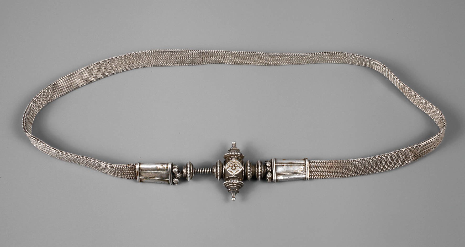 20. Jh., Silber geprüft, massives Flechtband mit aufwendig verzierter Schraubschließe, geringe Tragespuren, L ca. 78 cm, G ca. 246 g.
