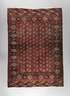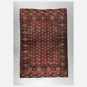 Mitte 20. Jh., rapportierender Dekor über dunkelrotem Fond, Schmalseiten etwas gekürzt, sonst gute Erhaltung, Maße 266 x 204 cm.