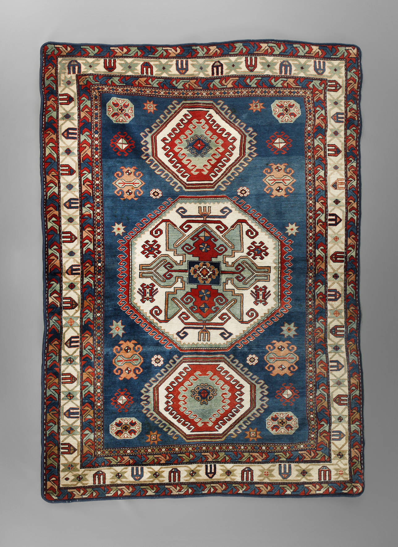 1. Hälfte 20. Jh., mit Lori Pambak-Motiv über blauem Fond, neu gekettelt, Maße 198 x 149 cm.
