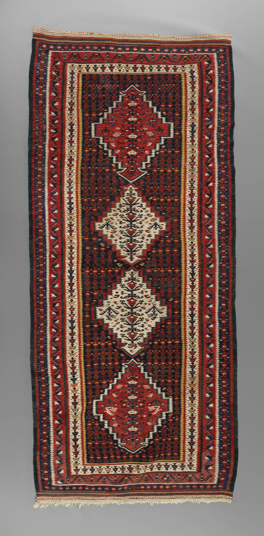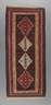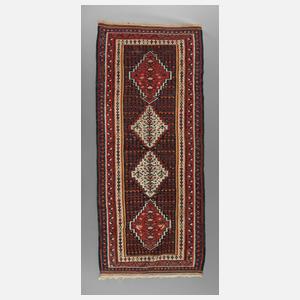 1. Hälfte 20. Jh., geometrischer Dekor über dunkelrotem Fond, mehrteilige umlaufende Bordüre, Maße 260 x 114 cm.