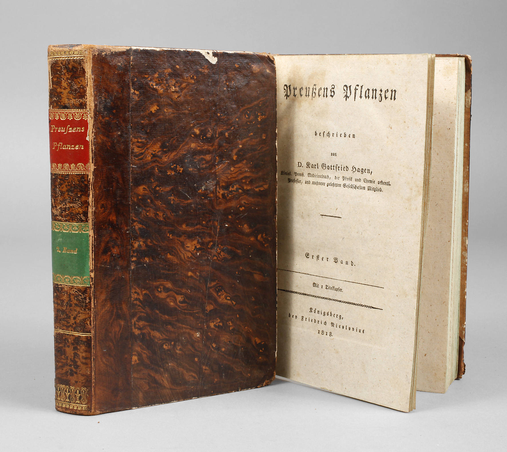 Preußens Pflanzen, beschrieben von D. Karl Gottfried Hagen, in zwei Bänden, bey Friedrich Nicolovius, Königsberg 1818, Format 8°, XII, 436 und 438 S., mit je einer gefalteten Kupfertafel mit Pflanzenabb., Grünschnitt, gleich gebunden im Halbledereinband der Zeit mit Rückengoldprägung und Exlibris (Else Born geb. Hagen), kaum stockfleckige Exemplare der Erstauflage, Einbände min. berieben.