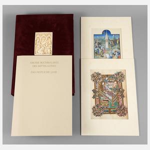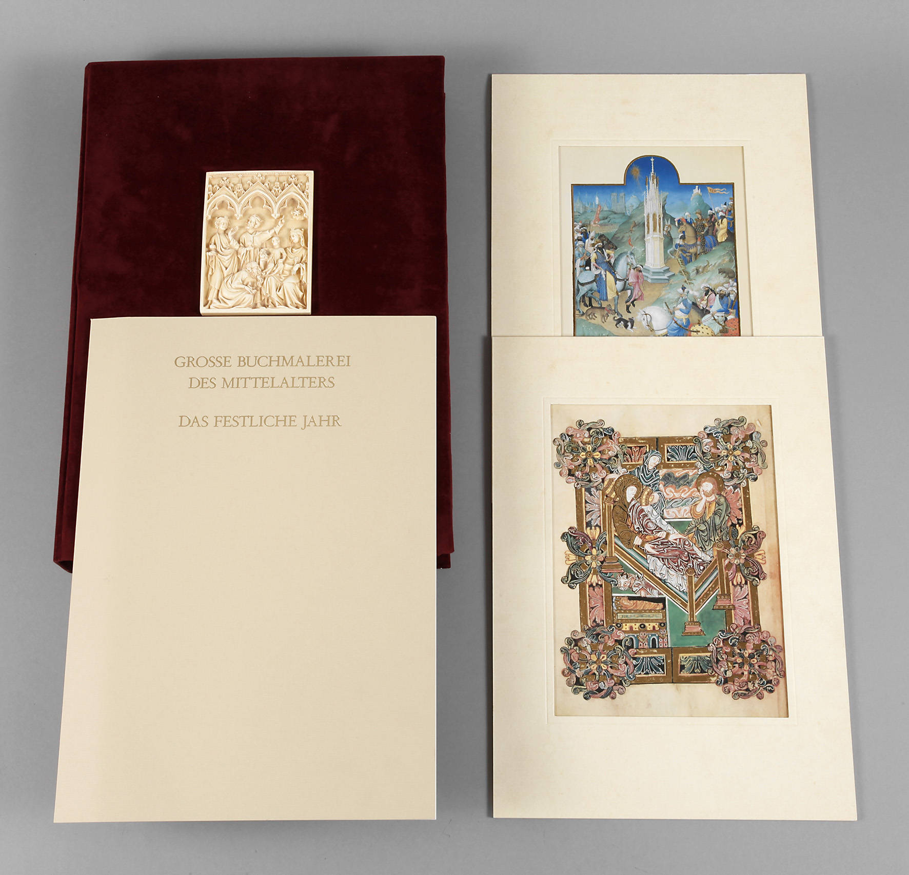 Das festliche Jahr, Exemplar Nummer 1093 (von 1495), Exklusiv-Ausgabe, Verlag Müller & Schindler, Stuttgart 1988, Folio-Format, beinhaltet wissenschaftl. Begleitheft mit 20 S. und zehn in Passepartout fixierte Faksimiles mit 23 1/2 Karat Echtgold-Auflage, Maße Passepartout 41 x 29 cm, lose in orig. bordeauxfarbener Samtkassette mit eingelassenem Faksimile einer Elfenbeinschnitzerei aus dem 14. Jh., fast verlagsfrisches Exemplar mit Schutzbox.