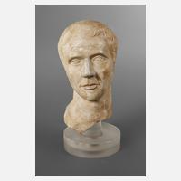 20. Jh., männliche lebensgroße Büste, erinnert entfernt an Bildnisse der römischen Soldatenkaiser, Marmor, auf Glassockel, normale Alters- und Witterungsspuren, H ca. 35 cm, B ca. 18 cm.