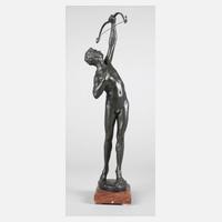 Anfang 20. Jh., unsigniert, Bronze braun patiniert, Aktdarstellung eines Mädchens mit offenem Haar, sich streckend, einen Arm zum Kopf erhoben, den anderen in den Rücken gestemmt, gute Erhaltung, Patina erneuert, auf einem Sockel aus Zöblitzer Granatserpentin, dieser minimal bestoßen, H Bronze 20 cm, H gesamt 27,5 cm.