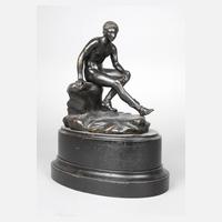 um 1900, unsigniert, Bronze dunkel patiniert, Antikenrezeption aus Herculaneum, auf naturalistisch gestalteter Felsenplinthe sitzende Aktdarstellung des jungen Merkur/Hermes, ein Bein zur Rast ausgestreckt, die Füße mit geflügelten Sandalen, auf ovalem, mehrteiligem, getrepptem und gekehltem Holzsockel, dieser geschwärzt, Patina partiell minimal berieben, sonst gute Erhaltung, H Bronze 20 cm, H gesamt 29,5 cm.