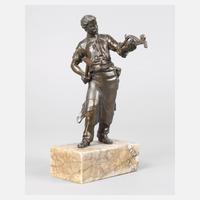 um 1900, unsigniert, Metallguss dunkel patiniert, einfach gekleideter Kunstschmied in Hemd und Werkschürze, sein Werkstück prüfend, in der anderen Hand einen Hammer, auf einen Steinsockel montiert, gute Erhaltung mit geringen Altersspuren, Sockel minimal bestoßen, H Skulptur 17 cm, H gesamt 21 cm.