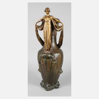 um 1900, am Fuß signiert J. Jozon, geprägte Nummer 9283 und Ausfuhrstempel: ”Bronze Garanti Au Titre L.V. Deposée”, Bronze vergoldet und mehrfarbig in grünlichen und roten Tönen in Kaltbemalung patiniert, Jugendstilschönheit als Halbakt, verhüllt von einem in weichen Falten fallenden Rock und einem weit am Vasenkorpus nach hinten fließenden und dort eine Lyra umhüllenden Tuch, introvertierte Darstellung mit gesenktem Kopf und ausgebreiteten Armen, auf einer Vase mit leicht bewegter Oberflächengestaltung als Meeresklippe, der Vasenfuß von Wellen umspült, winzige Altersspuren, sonst gute Erhaltung, H 72 cm. Künstlerinfo: französische Bildhauerin (1868 Paris bis 1946 ?), besuchte die Academie des Beaux-Arts in Bourges, lernte dort unter Denvs Puech, trat 1906 der Sociétaire des Artistes Français bei, arbeitete jahrelang für die Manufaktur von Edmond Lachenal. Quelle: Internet, Paul Arthur, French Art Nouveau Ceramics, An Illustrated Dictionary, Paris, 2015, S. 218. Info: Ausführung dort in Keramik abgebildet.