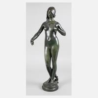 Ende 19. Jh., an der Plinthe signiert ”Antonin Charles Siot Paris” und Modellnummer ”P760”, Bronze grün patiniert, Mädchenakt als Personifizierung der Jugend, mit partiell geflochtenem Haar mit Blumen, in tänzerischer Pose, mit einer zur Brust erhobenen Hand, auf runder, getreppter und gekehlter Plinthe mit naturalistisch gestalteter Oberfläche und vegetabilen Elementen, die Skulptur wurde in Marmor 1883 im Pariser Salon sehr erfolgreich veröffentlicht, gute Erhaltung, H gesamt 79,5 cm. Künstlerinfo: eigentlich Antonin Jean Paul Charlès, französischer Bildhauer (1851 Gimont bis 1919 Paris), studierte in Marseille, an der Ecole des Beaux-Arts in Toulouse und der Ecole des Beaux-Arts in Paris, dort unter François Jouffroy und Ernest-Eugène Hiolle, erhielt den Großen Preis der Weltausstellung 1889, war Mitglied der Societé Artistes Francaise, war Ritter und später Kommandant der Ehrenlegion, er wurde auf dem Friedhof von Léguevin beigesetzt. Quelle: Internet.