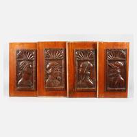 Renaissance, um 1600, Nussbaum massiv, jeweils fein geschnitzte figürliche Darstellung, darüber Muschelmotiv, Oberfläche mit inaktivem Anobienbefall, später auf Holzplatten montiert und lackiert, Maße Schnitzerei 42 x 20 cm.