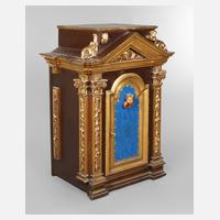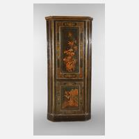 wohl 2. Hälfte 18. Jh., Nadelholz farbig gefasst, mit feinem ornamentalen Golddekor über schwarzgrünem Grund, Türfüllungen mit farbiger, teils reliefierter Malerei, Darstellung einer Tempelszene und Floralmotiv, Innenraum taubenblau gestrichen, stark geschwungen ausgesägte Einlegeböden, Schlösser erneuert, Altersspuren, H 203 x B 91 x T 59 cm.