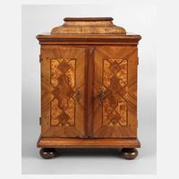 1. Hälfte 18. Jh., Nussbaum und Nussbaummaser auf Nadelholz furniert, zweitüriger Korpus, die Türen und Seiten mit geometrischen Einlegearbeiten, in Vogelaugenahorn, Nussbaumwurzel, Ahorn und Zwetschge, innen drei Schubladen mit unterschiedlichen Messingknäufen, Knäufe alt ergänzt, orig. Schloss und Schlüssel, H 50 x B 36 x T 21 cm.