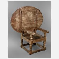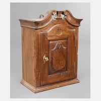 Mitte 18. Jh., Nussbaum massiv, eintüriger kleiner Wandkasten mit geschnitzter Türfüllung, Profilgesims mit gesprengtem Giebel, geschmiedete Wandhalterung, Alters- und Gebrauchsspuren, H 62 x B 46 x T 27 cm.