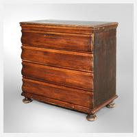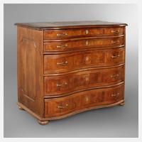 mitteldeutsch, Mitte 18. Jh., Eiche massiv, nussbaumfurniert, fünfschübiger Korpus, mit zweifach gebauchter Front, Messingbeschläge alt ergänzt, seitlich mit geschnitzter Füllung, Alters- und Gebrauchsspuren, Maße 98 x 124 x 63 cm.