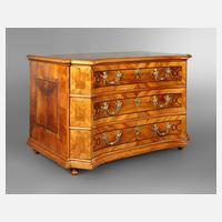 deutsch, Mitte 18. Jh., Nussbaum und Nussbaummaser auf Nadelholz furniert, originale Beschläge aus vergoldeter Bronze, dazu ein originaler Schlüssel, dessen Reite aus ornamental geschnittenem Eisen, dreischübiger Korpus mit konkav gebauchter Front und schräg ausgestellten Ecken, allseitig verziert mit von Bandintarsien gerahmten Feldern aus Wurzelholz, kleine Furnierfehlstelle am oberen Schub, alt restauriert, H 82 x B 122 x T 76 cm.