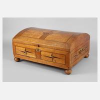 Mitte 18. Jh., Eiche furniert, allseitig mit eingelegtem Sternmotiv, der leicht gewölbte Deckel mit vier Kassetten und eingelegtem Kleeblatt, wohl später innen komplett mit Zinkblech ausgekleidet, kleine Furnierfehlstellen, Beschläge ergänzt, Maße 33 x 64 x 50 cm.
