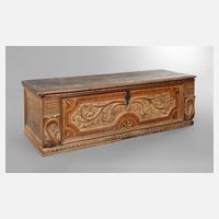 wohl Italien, Anfang 18. Jh., Nussbaum massiv, frontseitig intarsierte Kassettenfüllung, mit Reliefschnitzerei, Weinrebenmotiv, die breiten Lisenen ebenfalls geschnitzt, originales Schloss, Schlüssel fehlt, Deckel mit altem Trocknungsriss, unrestaurierter Originalzustand, H 54 x B 170 x T 55 cm.