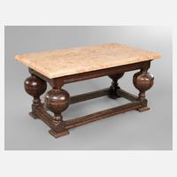 Italien, 18. Jh., Gestell aus massiver Eiche, dunkelbraun gebeizt, gedrechselte Baluster, Zarge und Fußgestell kanneliert, frei im Raum stellbar, rot geäderte Marmorplatte später ergänzt, H 52 x B 100 x T 60 cm.