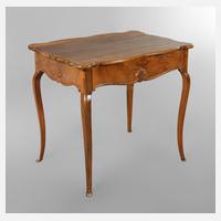 wohl Ende 18. Jh., Nussbaum massiv, rechteckige Platte mit passig geschweiftem Rand, Zarge mit Schubkasten, allseitig mit geschnitzten Palmetten verziert, schlanke, s-förmig geschwungene Beine, ein Bein restauriert, ein Bein ergänzt, H 77 x B 85 x T 59 cm.