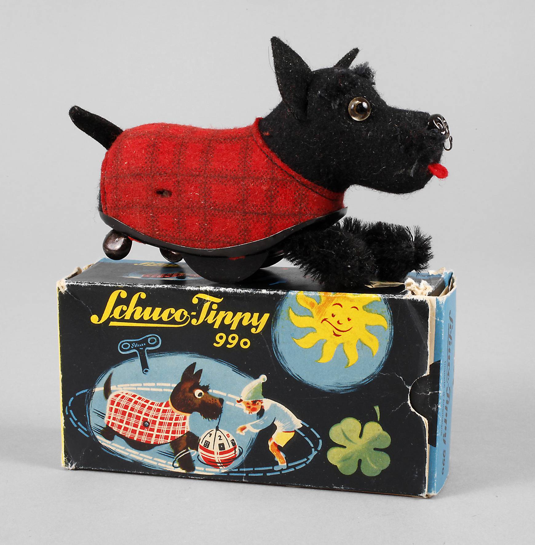 als Scotch-Terrier, um 1950, gemarkt Schuco Patent, Made in US-Zone Germany, Blechgehäuse mit Stoffüberzug, Uhrwerk und Laufmechanismus intakt, ohne Schlüssel und Ball mit Glückszahlen als Ausfüllhilfe für den Totoschein bzw. Punkte fürs Würfelspiel, in orig. Karton, dieser minimal eingerissen, unbespielter Zustand, L 12 cm.