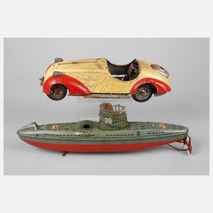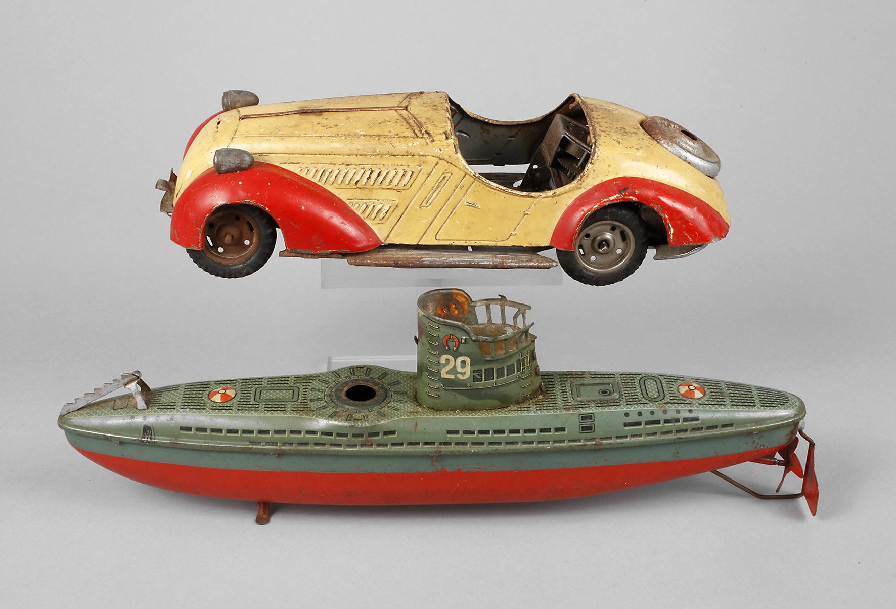 Arnold U-Boot 2005 sowie Distler Wanderer Cabrio 3150, beide 1930er Jahre, ungemarkt, Blech farbig lithogr., mit intaktem Uhrwerkantrieb, fragmentarische Zustände, L 32 und 24,5 cm.