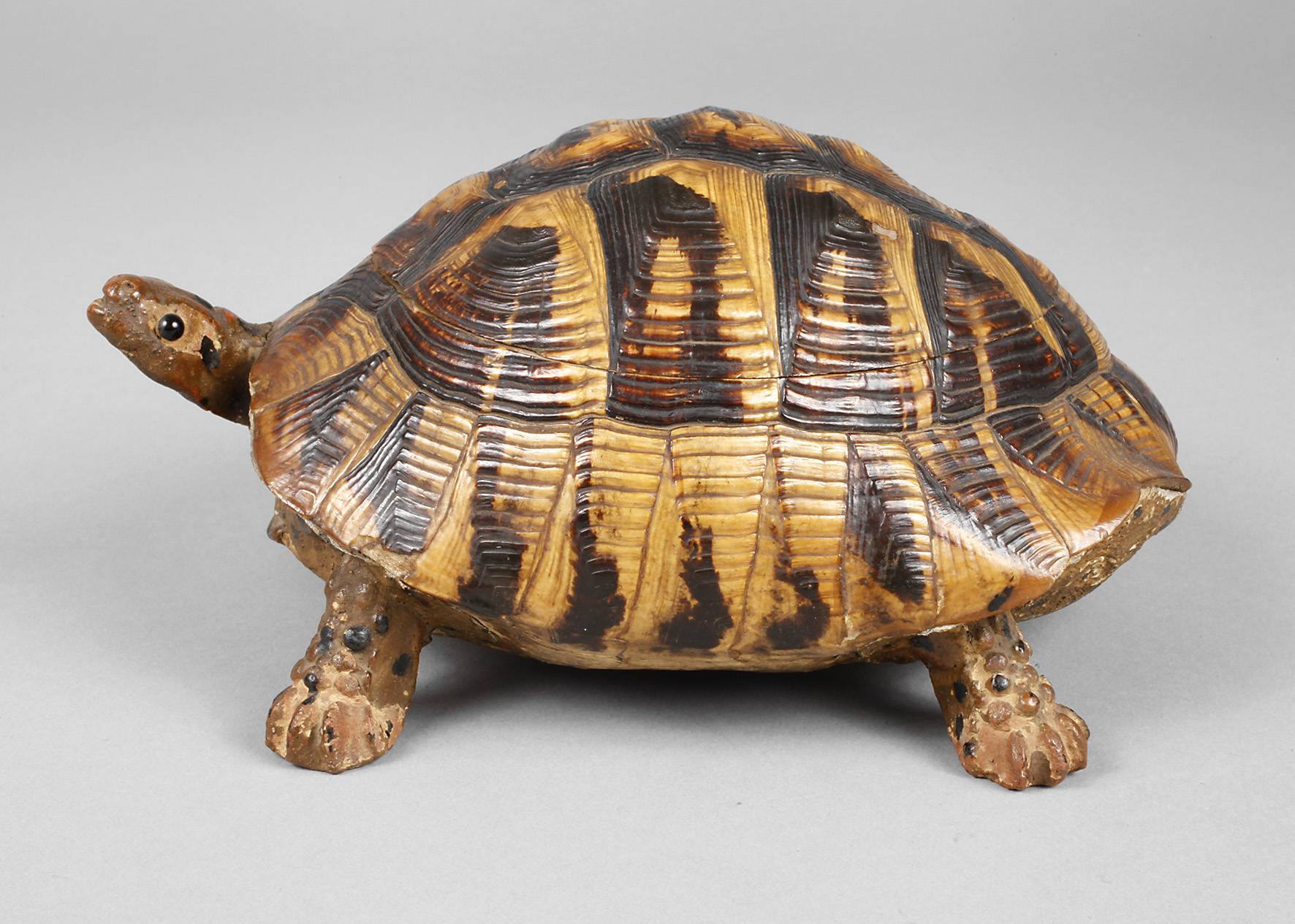 1. Hälfte 20. Jh., gestaltet aus dem Panzer einer griechischen Landschildkröte, der Körper aus einem harten plastischen Material, Innenleben mit Seide ausgeschlagen, der Deckel innen vergoldet, gute Erhaltung, L 18 cm, H 9,5 cm.
