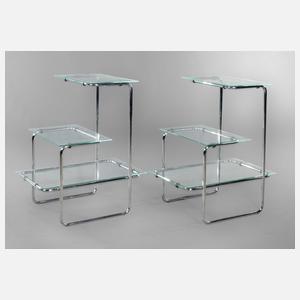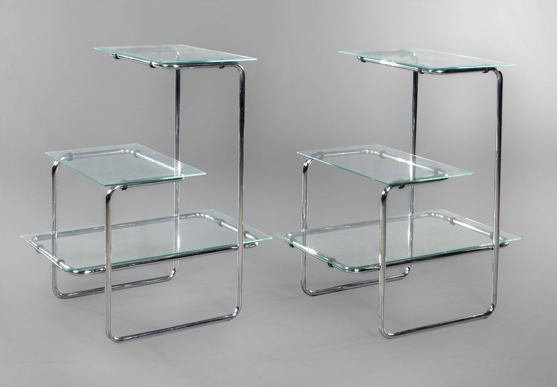 Entwurf A. Guyot für Thonet um 1927/30, Modell B 136, Ausführung 1930er Jahre, Stahlrohr verchromt und verschraubt, Gummiringe als Auflage für die Glasböden, Glasböden ergänzt, Chrom Z 2, normale Altersspuren, Maße mit Glasböden 86 x 76 x 45 cm.