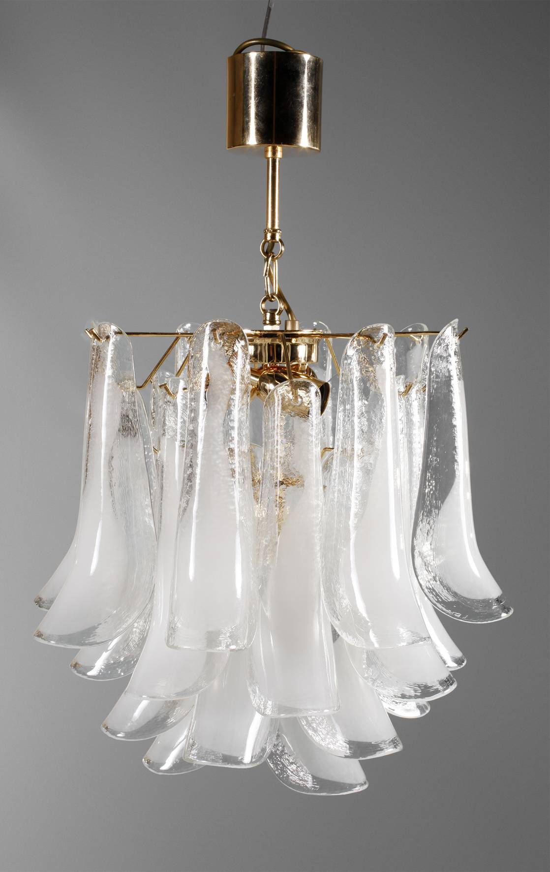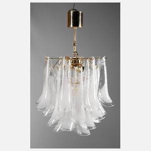 Italien, 1960er Jahre, abgehängte Schalen in Form eines Blütenkelchs, aus klarem, unregelmäßig strukturiertem Glas mit eingeschmolzenen Milchglasstreifen, H 64 cm, D 53 cm.