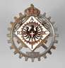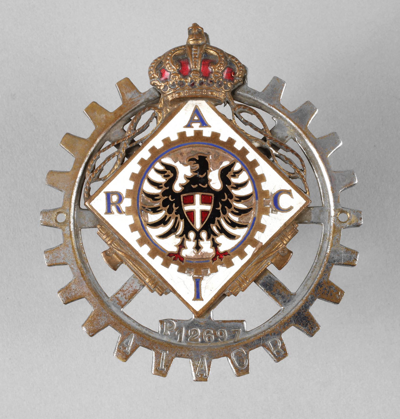 1930er Jahre, gemarkt RACI (Reale Automobile Club d'Italia) sowie AIACR (Association Internationale des Automobile Clubs Reconnus), nummeriert P12697, Messing, teils verchromt bzw. emailliert, leichte Altersspuren, D 7,5 cm.