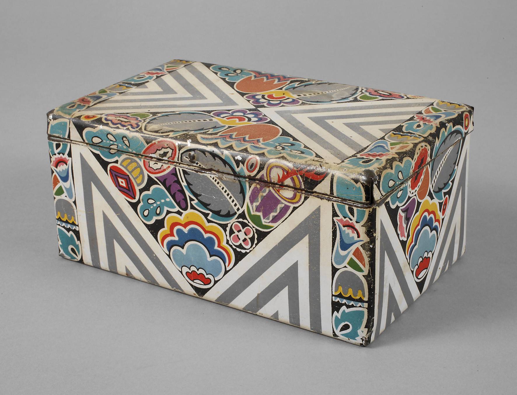 Entwurf Emanuel Josef Margold um 1914, am Boden gemarkt H. Bahlsens Keks-Fabrik Hannover, Weißblech farbig lithografiert bzw. vergoldet, langrechteckiger Korpus mit scharniertem Deckel, umlaufend stilisiertes Blütendekor und Bandornamente, Oberfläche berieben Z 2, Maße 8,5 x 18,5 x 11,5 cm.