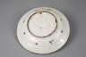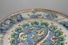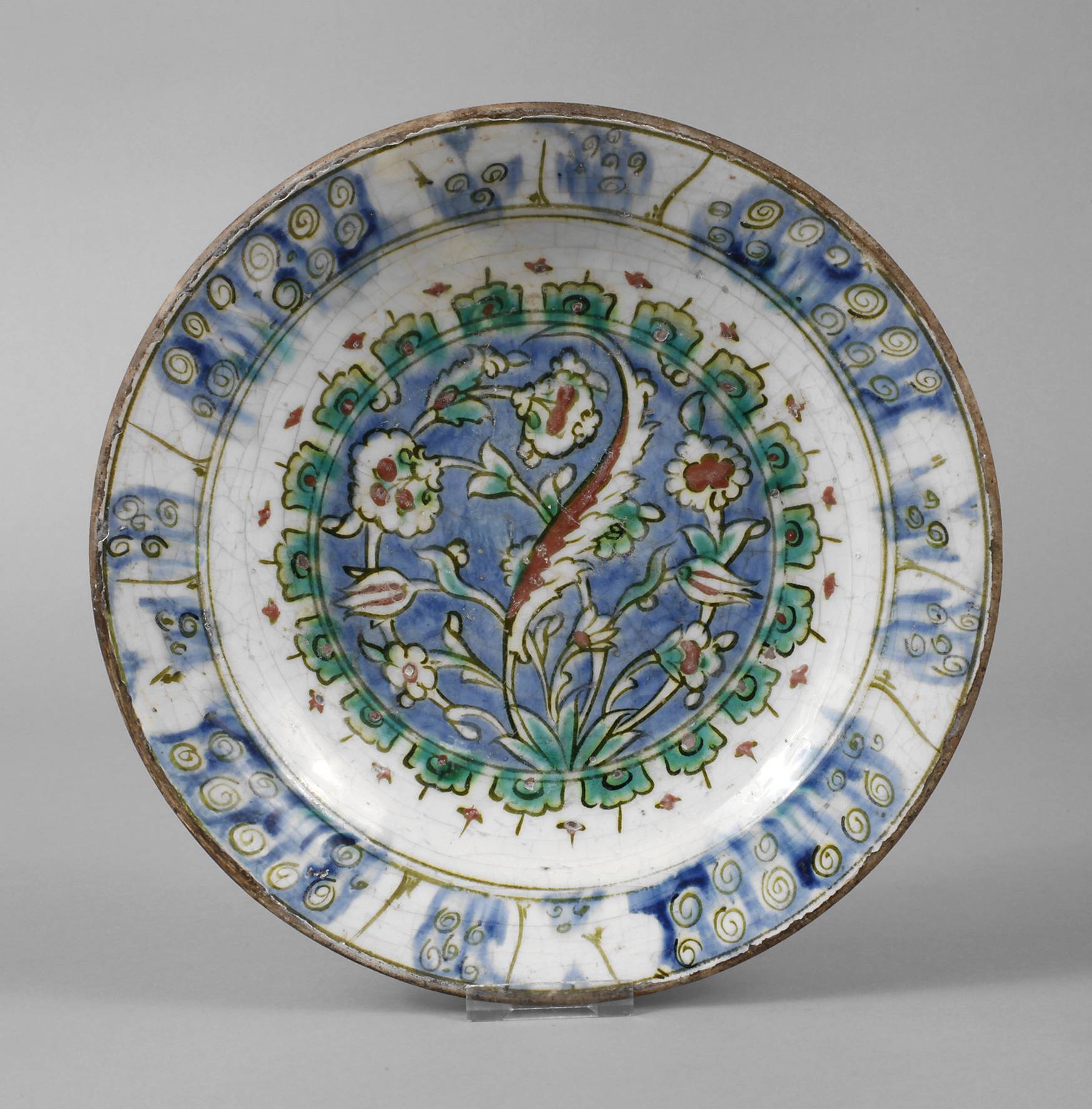Türkei, um 1600, Quarz-Fritten-Keramik, mit weißlicher Craqueléglasur und feinem Pinseldekor in Kobaltblau, Rotbraun und verschiedenen Grüntönen, schauseitig Blütenranken im Ornamentband, auf der Fahne Spiralmotive, diese auch rückseitig gemalt, Standring mit größerem Ausbruch, Wandaufhängung, Gebrauchs- und Altersspuren, D 30 cm.