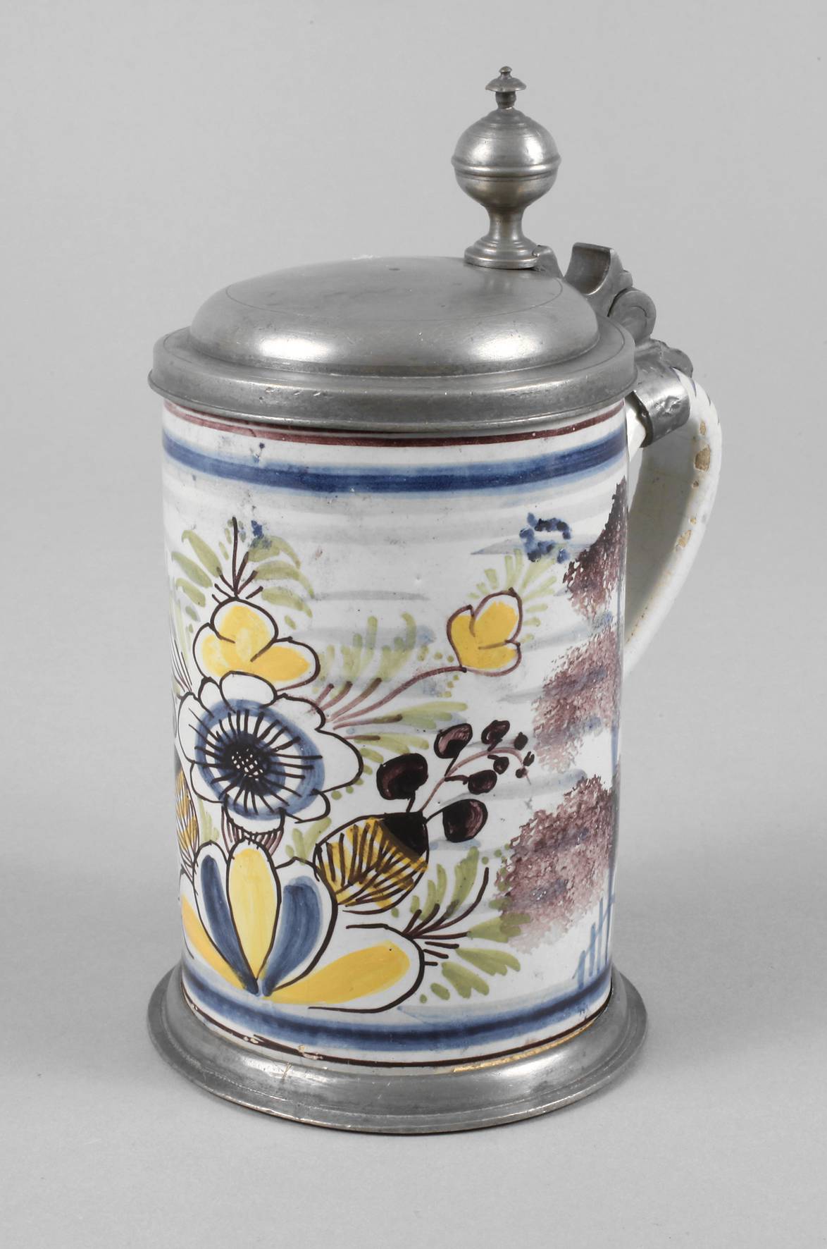 Periode Fränkel-Schreck 1745–1747, am Boden gepinselte Nummer 4., leicht bläuliche Glasur, mit bunten Scharffeuerfarben bemalt, schauseitig ein Blütenbukett, seitlich zwei geschwämmelte Bäume, Zinnstandring, übergreifender Deckel mit Kugeldrücker, innen stärker glasurrissig und viele Glasurabplatzer am Lippenrand, H 18 cm.
