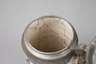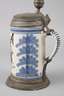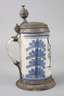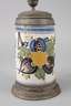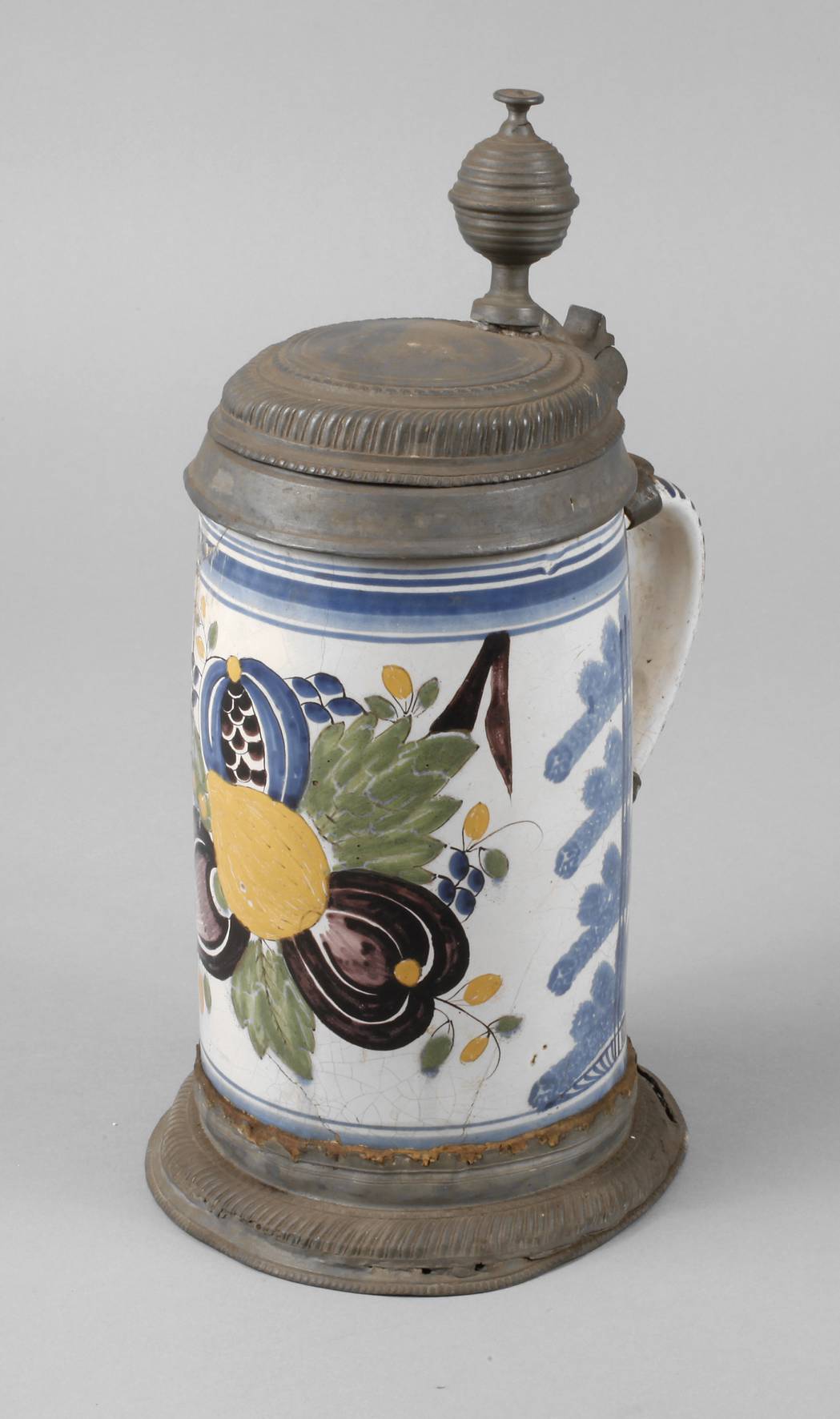 wohl Bayreuth, 2. Hälfte 18. Jh., Fayence mit bunten Scharffeuerfarben auf hellem Grund bemalt, schauseitig große Früchte, seitlich geschwämmelte Bäume in Kobaltblau, Zinnmontierung, bestehend aus geripptem durchgehenden Boden, floralem Band am Griffende, Lippenrand und übergreifendem Deckel mit großem Kugeldrücker, graviert G.H., datiert 1786, Montierung stärker korrodiert und gedellt, Krug gebrochen und geklebt, restaurierungsbedürftig, H 29 cm.