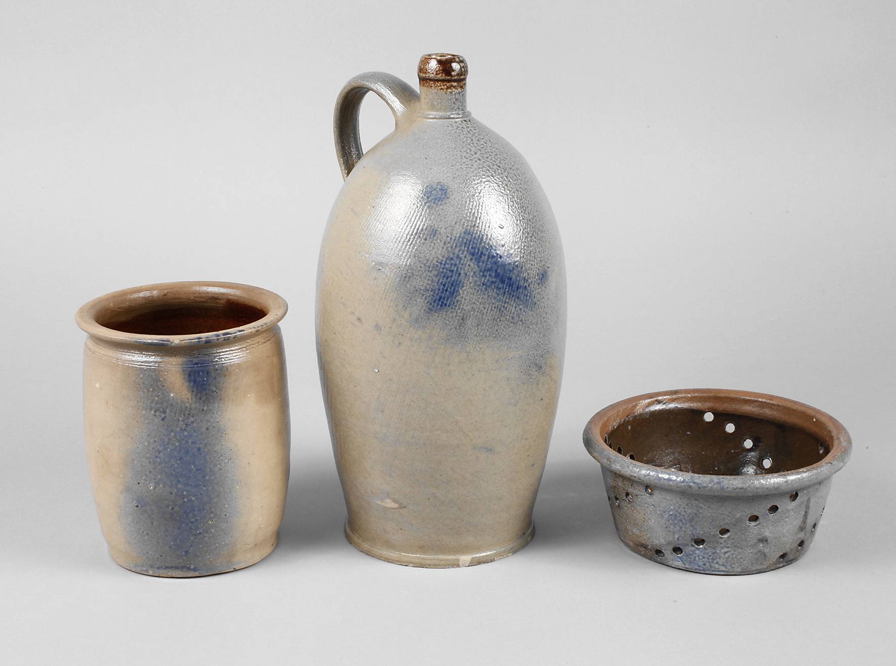 um 1900, graues Steinzeug handabgedreht, Blauschürzenflasche und Topf mit schräg gekämmter Wandung, dazu ein Sieb, Flasche am Stand minimal bestoßen, H diese 31 cm.