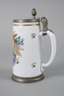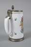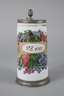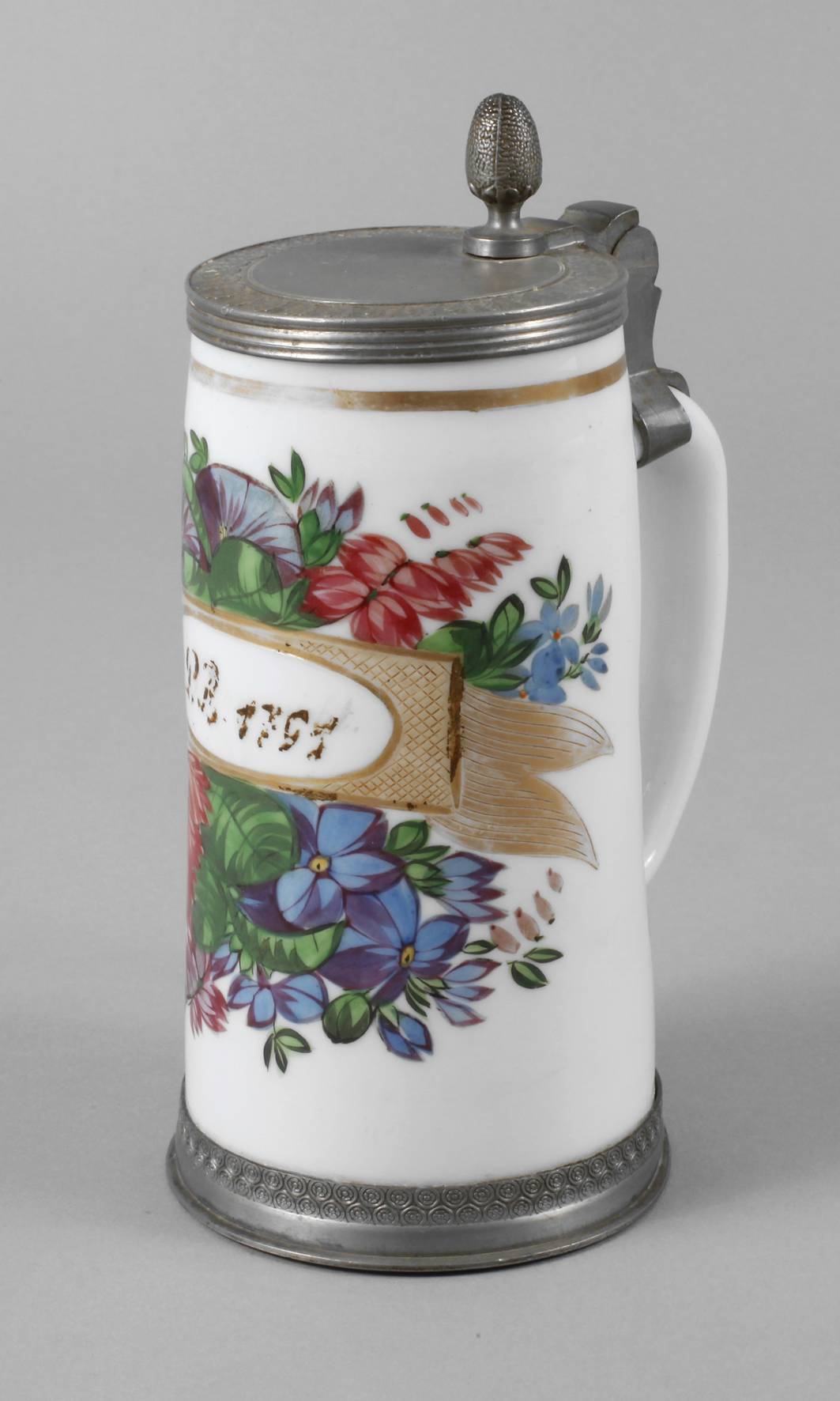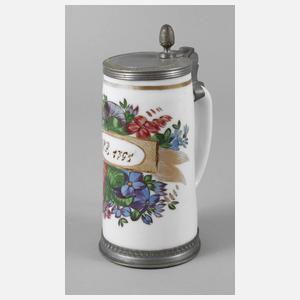 in schauseitiger Kartusche monogrammiert ”P.B.” und datiert, Milchglas mit Abriss, leicht konische Form mit angesetztem gekniffenen Henkel, opake farbige Emailmalerei mit Gold, die Kartusche graviert, Zinnmontierung, bestehend aus Standring und Deckel, dieser monogrammiert ”E.S.”, normale Altersspuren, H 19,5 cm.