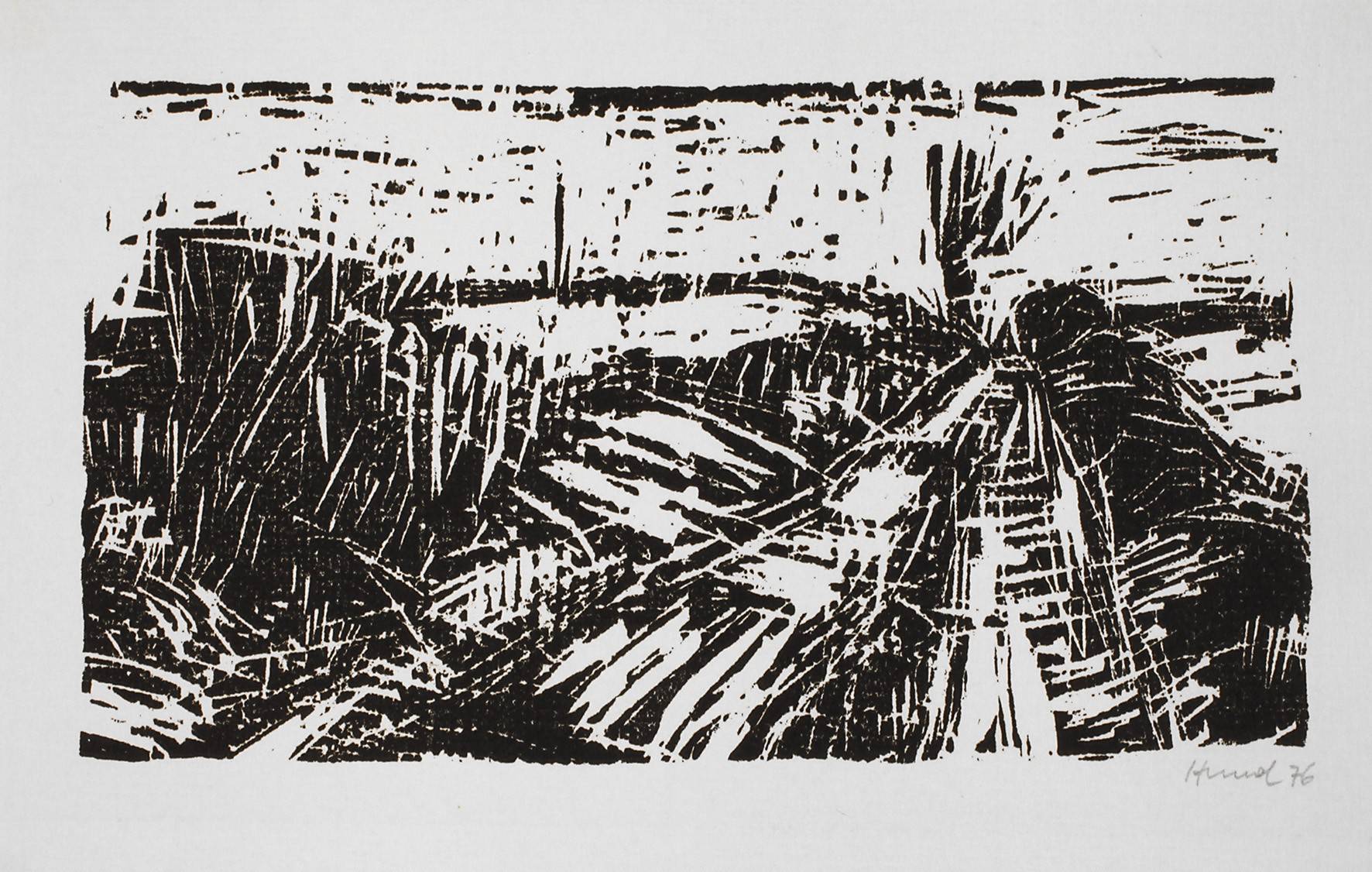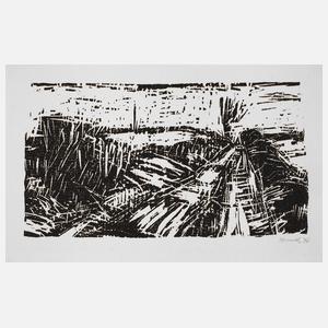 von Bäumen und Büschen gesäumter Weg in flacher Landschaft, Holzschnitt, unter der Darstellung rechts in Blei signiert und datiert „Hund (19)76“, in den Ecken leichte Spuren von früherer Montierung, ungerahmt, Darstellungsmaß ca. 10 x 17,6, Blattmaß ca. 14,5 x 21,5 cm. Künstlerinfo: dt. Maler und Grafiker (1940 in Wurzen geboren), 1955–58 Lehre als Dekorationsmaler, 1959–62 Studium an der Fachschule für angewandte Kunst in Potsdam, als Maler und Grafiker Autodidakt, fand Anregung für sein Werk bei den Künstlern Curt Querner, Theodor Rosenhauer und Otto Griebel, seit 1962 freischaffend in Wurzen tätig, Mitglied im VBK der DDR, Quelle: Eisold „Künstler in der DDR und Internet.