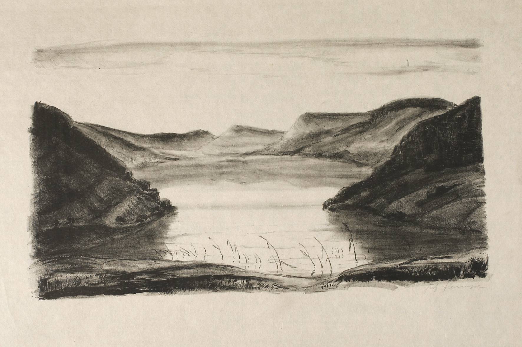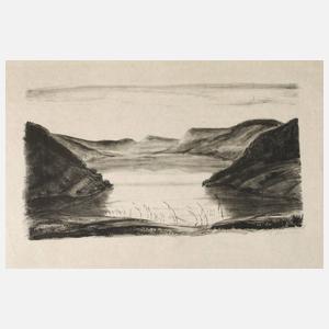von Bergen umgebener stiller See, unter wolkenlosem Himmel, feintoniges Blatt, Kreidelithografie auf Japanpapier, um 1920, unter der Darstellung rechts in Blei signiert „Fritz Kempe“, minimale Erhaltungsmängel, ungerahmt, Darstellungsmaß ca. 24 x 43 cm, Blattmaß ca. 41 x 53 cm. Künstlerinfo: dt. Maler und Grafiker (1898 Leipzig bis 1971 Dresden), Lehre als Schriftsetzer, ab 1919 Studium an der Akademie für graphische Künste und Buchgewerbe in Leipzig bei Alois Kolb, anschl. tätig als Kunsterzieher und Leiter einer Buchbinderei, 1942 Ernennung zum Professor, im Krieg Zerstörung eines Großteils seines Werkes, ab 1952 in Dresden ansässig, Mitglied im VBK der DDR, Quelle: Vollmer, Eisold „Künstler in der DDR” und Wikipedia.