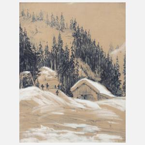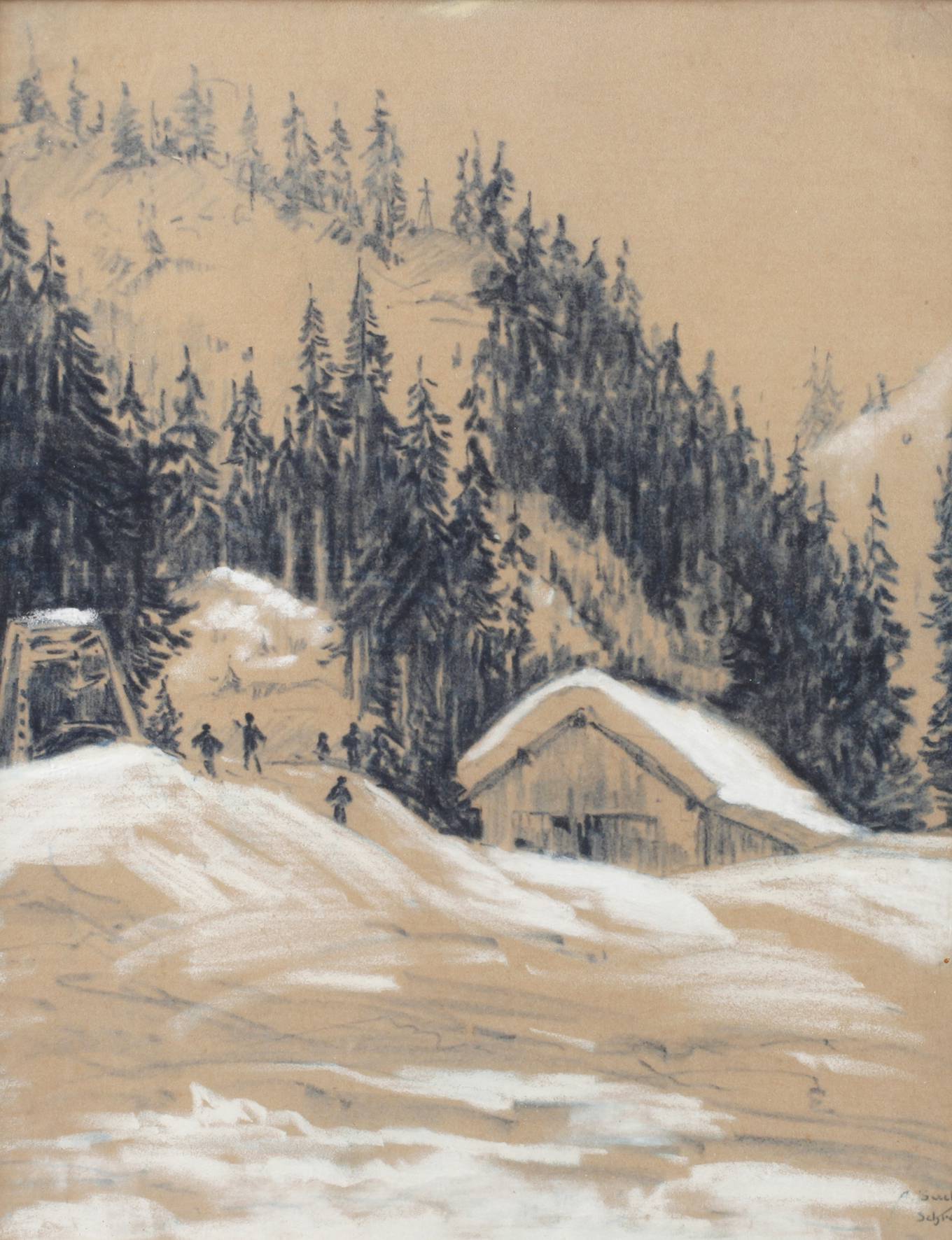 Skifahrer an der Talstation eines Lifts im Skigebiet Arlberg, skizzenhaft-flott erfasste Mischtechnik (schwarzer Filzstift und weiße Pastellkreide auf beigem Papier), rechts unten handsigniert, datiert und ortsbezeichnet ”A. Sachs (1967) Schröcken”, Provenienz: Familie des Adolf Sachs, Montierung etwas durchschlagend, hinter Glas gerahmt, Falzmaß ca. 40,5 x 33 cm. Künstlerinfo: dt. Entwerfer und Maler (1902 bis 1986), Mitglied der vogtländischen Malerfamilie Sachs, Schüler seines Vaters Richard Sachs (1875–1946), Schüler der Kunstschule Plauen, hier später zeitweise Dozent, unterhielt 1931–45 ein großes Entwurfsatelier in Plauen, ab 1945 in Kiel, betrieb ab 1953 ein Musteratelier, vor allem für Tapeten-, Stoff- und Teppichentwürfe in Bad Homburg vor der Höhe, zeitweise auch in Köln als Entwerfer tätig, Quelle: Frank Weiß ”Malerei im Vogtland”, Familie des Künstlers und Hanna Elisabeth Koch „Schönheit hat heute einen neuen Sinn”.