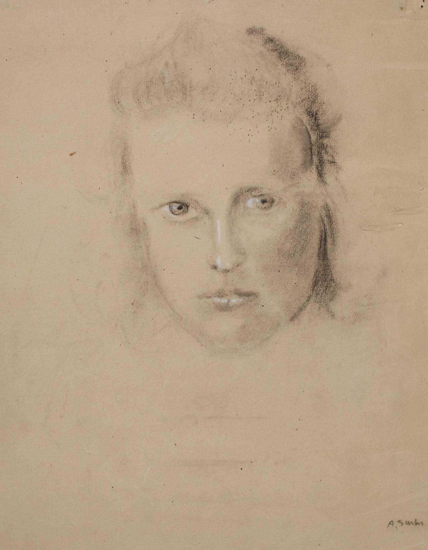 einfühlsame Kopfstudie, laut Nichte des Künstlers Bildnis der Elfriede Sachs (1905 bis ca. 2000), Mischtechnik (Kohle mit Weißhöhung auf getöntem Papier), um 1920, rechts unten signiert ”A. Sachs”, Provenienz: Familie des Adolf Sachs, Reißzweckenlöchlein, rückseitig Montierungsspuren, geringe Erhaltungsmängel, ungerahmt, Blattmaß ca. 30,5 x 24 cm. Künstlerinfo: dt. Entwerfer und Maler (1902 bis 1986), Mitglied der vogtländischen Malerfamilie Sachs, Schüler seines Vaters Richard Sachs (1875–1946), Schüler der Kunstschule Plauen, hier später zeitweise Dozent, unterhielt 1931–45 ein großes Entwurfsatelier in Plauen, ab 1945 in Kiel, betrieb ab 1953 ein Musteratelier, vor allem für Tapeten-, Stoff- und Teppichentwürfe in Bad Homburg vor der Höhe, zeitweise auch in Köln als Entwerfer tätig, Quelle: Frank Weiß ”Malerei im Vogtland”, Familie des Künstlers und Hanna Elisabeth Koch „Schönheit hat heute einen neuen Sinn”.