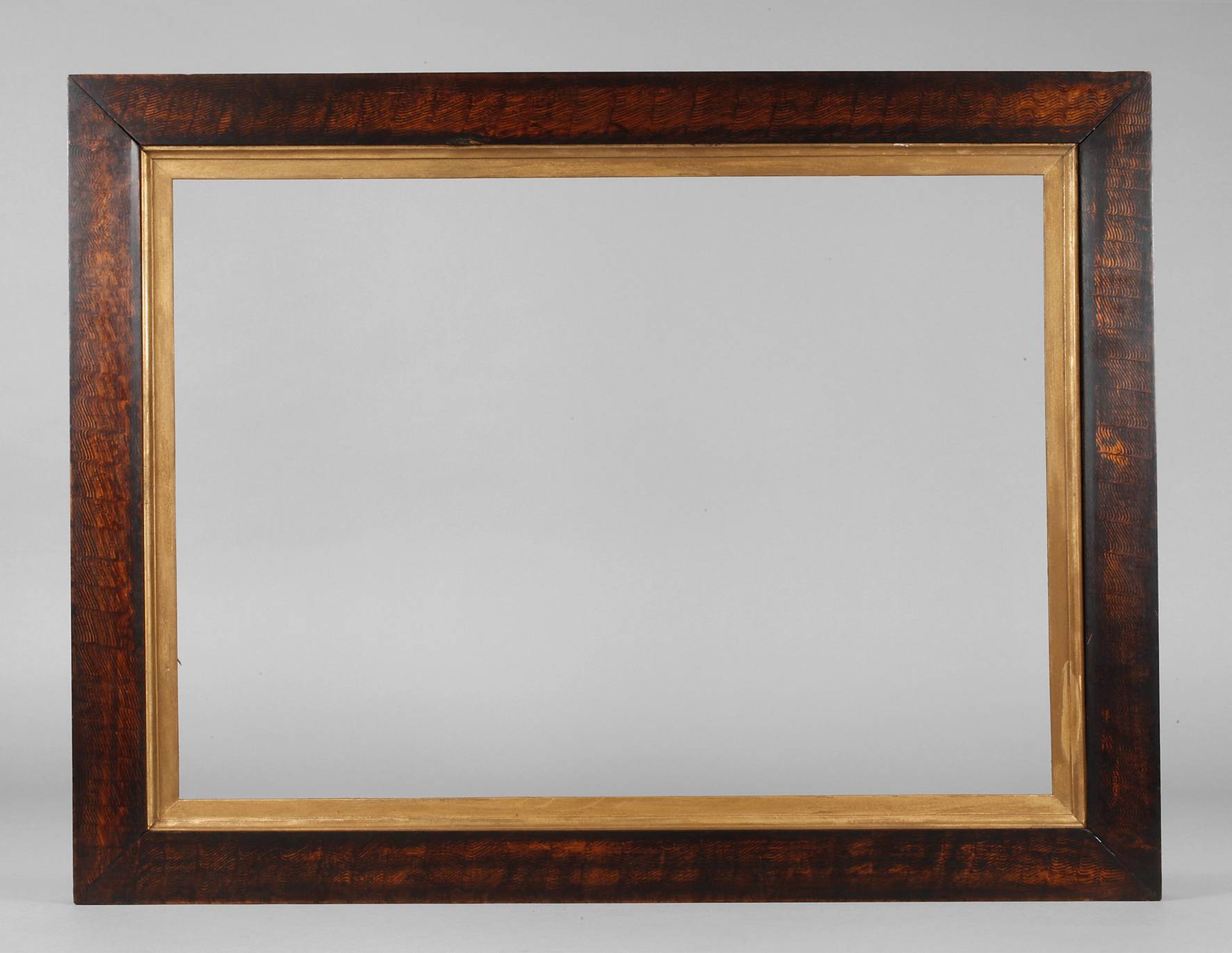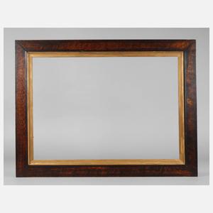 Rahmen aus ca. 8,5 cm breiter, schlicht profilierter, hell furnierter Holzleiste, um 1860, mit wellenförmig aufgetragener dunkler Lasur überfasst, mit goldbronziertem Inlay, Gehrungen geschnitten, Falzmaß ca. 52,5 x 72,5 cm.