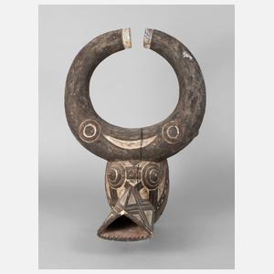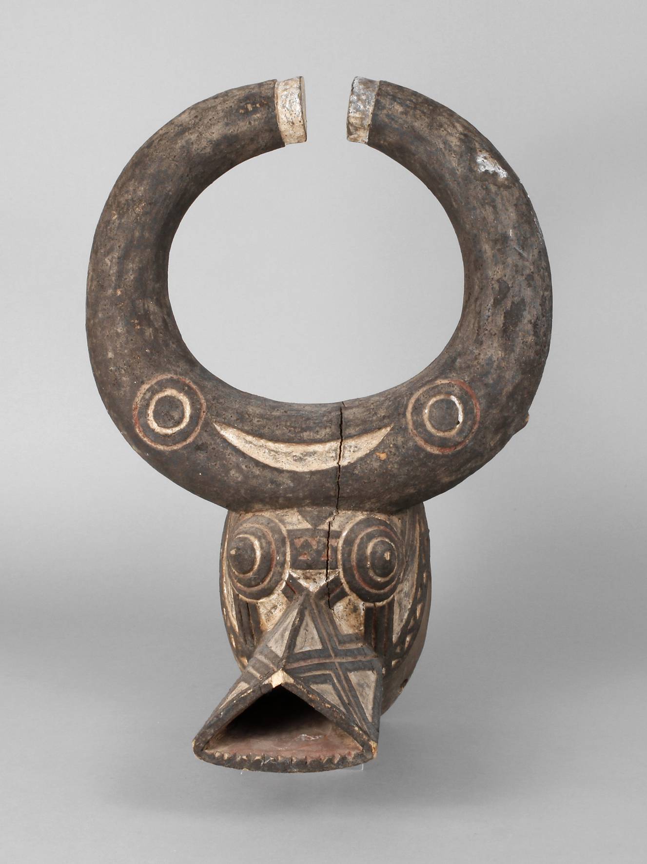 unbekannten Alters, dem Manamkult der Goemai zugeordnet, einer Volksgruppe in Nordnigeria am Shemankar-Fluss, leichtes Tropenholz, aufwendig nach alten Vorbildern gearbeitet und in Weiß, Braun und Rot bemalt, H ca. 56 cm, D Hörner 37 cm.